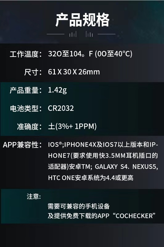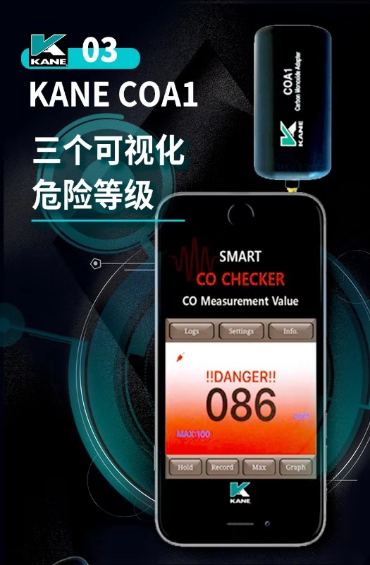 英國KANE凱恩手機(jī)銜接一氧化碳探測儀 KANE COA1 一氧化碳探測儀 手機(jī)銜接解決方案 • 可探測一氧化碳至1ppm • 一氧化碳讀取至999ppm • 與iOs或安卓系統(tǒng)兼容 • 可在免費(fèi)APP上顯示3個危險(xiǎn)等級 • APP上可以保存數(shù)據(jù)和發(fā)送郵件數(shù)據(jù) • 工作溫度:32O至104℉(0O至40℃) • 準(zhǔn)確度:±(3%+1PPM
