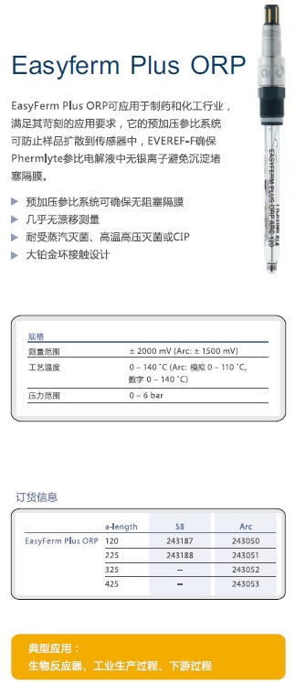 EasyFerm Plus ORP可應(yīng)用于制藥和化工行業(yè),,滿足其苛刻的應(yīng)用要求,,它的預(yù)加壓參比系統(tǒng)可防止樣品擴(kuò)散到傳感器中,,EVEREF-F確保Phermlyte參比電解液中無銀離子避免沉淀堵塞隔膜。