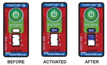 TempDot™Plus標(biāo)簽應(yīng)存儲(chǔ)在室溫下,,并必須在反應(yīng)溫度閾值以上被激活。激活是通過(guò)用手指推壓。"On"字出現(xiàn)在第一個(gè)窗口中顯示激活。之后5分 鐘內(nèi),在反應(yīng)溫度或低于反應(yīng)溫度的情況下將標(biāo)簽貼到產(chǎn)品上。藍(lán)色染料熔化并以控制的速率遷移,經(jīng)過(guò)白色大窗口。這表示暴露在溫度閾值以上的累計(jì)時(shí)間。當(dāng)溫 度低于閾值時(shí),該染料固化并停止移動(dòng)。如果溫度超過(guò)閾值,,TempDot®Plus標(biāo)簽提供即時(shí)的視覺(jué)跡象。
