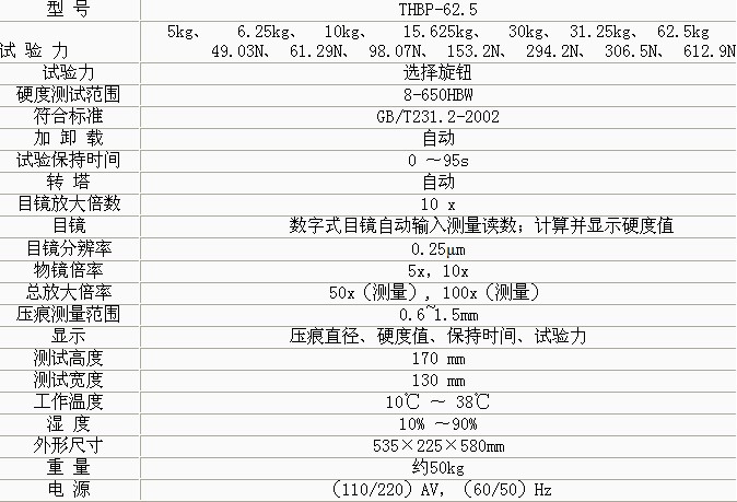 產(chǎn)品概述: THBP-62.5數(shù)顯小負(fù)荷布氏硬度計(jì)是光機(jī)電一體化的高新技術(shù)產(chǎn)品,硬度計(jì)維修,它造型新穎、美觀,硬度計(jì)價(jià)格,具有良好的直觀性、可操作性和可靠性,布氏硬度計(jì)壓頭,是測(cè)試小負(fù)荷布氏硬度的理想產(chǎn)品。 功能特點(diǎn): 1 、 儀器具備7級(jí)試驗(yàn)力,8種測(cè)試的布氏標(biāo)尺任意選擇; 2、具備了5x 和10x 兩組物鏡,昆山布氏硬度計(jì),且都能參與測(cè)量; 3、物鏡和壓頭間智能式自動(dòng)切換; 4、預(yù)置試驗(yàn)力保持時(shí)間、調(diào)節(jié)測(cè)量光源的強(qiáng)弱功能; 5、自動(dòng)顯示測(cè)量壓痕長(zhǎng)度、硬度值、測(cè)量次數(shù)等;帶熱敏打印機(jī)。 6、硬度測(cè)試結(jié)果打印輸出,布氏硬度計(jì)標(biāo)準(zhǔn),RS232超級(jí)終端設(shè)置,供用戶擴(kuò)展功能。 7、硬度計(jì)還可根據(jù)用戶特殊需求配置CCD裝置、視屏測(cè)量裝置和攝像裝置。 8、本儀器采用精密的結(jié)構(gòu)設(shè)計(jì),手持式布氏硬度計(jì),試驗(yàn)力施加由力值傳感器控制,使整機(jī)結(jié)構(gòu)緊湊,青島布氏硬度計(jì)培訓(xùn),加卸試驗(yàn)力時(shí)平穩(wěn)、準(zhǔn)確。在電氣上由CPU控制試驗(yàn)過程,物鏡和壓頭采用智能式自動(dòng)切換,硬度計(jì)測(cè)頭,切換定位采用機(jī)械與電子雙重配合,進(jìn)口硬度計(jì),使定位精度更高。 9、本儀器適用于測(cè)量鑄鐵、有色金屬及合金材料,布氏硬度 洛氏硬度 維氏硬度,各種退火、調(diào)質(zhì)處理后的鋼材。特別是較軟的金屬如:鋁、鉛、錫等材料測(cè)試的硬度值更正確。 技術(shù)參數(shù):