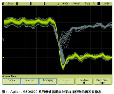 圖1 是用 Agilent's 6000 系列示波器捕獲到的毛刺該示波器甚至能在帶sin(x)/x重建時(shí)用實(shí)時(shí)采樣達(dá)到100,000 次/ 秒的波形更新。在這一更新率下示波器捕獲到該特用實(shí)時(shí)采樣捕獲亞穩(wěn)態(tài)定信號的統(tǒng)計(jì)概率約為每秒二次。采用專有MegaZoom III 技術(shù)的Agilent示波器實(shí)現(xiàn)了這一業(yè)內(nèi)領(lǐng)先的更新率。