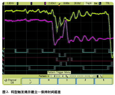 一旦我們發(fā)現(xiàn)電路存在非預(yù)期的行為就可開始進(jìn)一步調(diào)試我們的系統(tǒng)。使用混合信號示波器(MSO)的邏輯通道就能設(shè)置跨多個(gè)模擬和數(shù)字通道的組合邏輯碼型觸發(fā)條件。它揭示由于時(shí)鐘抖動我們的系統(tǒng)偶爾出現(xiàn)對建立 保持時(shí)間指標(biāo)的超差如圖2 所示。