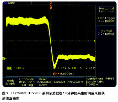 圖3 是嘗試用Tektronix TDS3000 系列示波器捕獲同樣的異常事件該示波器采用默認(rèn)的實(shí)時(shí)采集模式具有10 k 點(diǎn)的最大存儲器。由于在此特定條件下的示波器更新不到每秒 800 次把探頭放在測試點(diǎn)上 10 秒后我們未捕獲到任何異常。在這一更新率下一般需要在該測試點(diǎn)上探測 1 分鐘才能捕獲到每 50,000個(gè)周期平均僅產(chǎn)生一次的一個(gè)偶發(fā)毛刺。