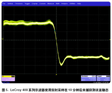 圖 4 是使用 Tektronix 高性能TDS5000 系列示波器的類似例子它有100,000 波形/ 秒的標(biāo)志性波形3用實(shí)時(shí)采樣捕獲亞穩(wěn)態(tài)(續(xù))更新率指標(biāo)。但由于其默認(rèn)的實(shí)時(shí)采集更新率被限制為只有60 波形/秒因此捕獲到該異常仍僅有很低的概率。雖然60 波形/ 秒對于示波器的“實(shí)況”感覺是足夠快的但為捕獲到僅僅一個(gè)毛刺需要把探頭放在測試點(diǎn)上的平均時(shí)間將近 14 分鐘。