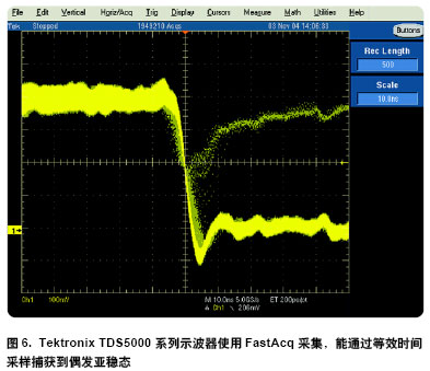 在使用四種不同示波器實(shí)時(shí)采集模式的上述例子中只有采用MegaZoom技術(shù)的 Agilent MSO6000系列示波器能可靠捕獲偶發(fā)的亞穩(wěn)態(tài)(圖1)。但使用其它“專門”采集模式時(shí)情況又會如何呢?如前所述Tektronix TDS5000 系列示波器宣稱具有高于100,000 波形/ 秒的標(biāo)志性波形更新率指標(biāo)。該更新率對捕獲偶發(fā)事件(50,000 周期中的1個(gè))應(yīng)是足夠的。使用Tektronix 的FastAcq采集模式TDS5000系列示波器確能以超過100,000/ 秒的采集捕獲波形如圖6所示。但為使用這一工作模式您必須作出多方面的權(quán)衡。該FastAcq 模式: