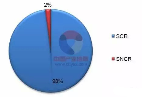后端煙氣脫硝技術(shù)主要有:選擇性催化還原法(SCR)、選擇性非催化還原法(SNCR)、SNCR-SCR混合法。其中SCR脫硝效率為70-90%SNCR脫硝效率僅為40-60%。在已投運(yùn)火電脫硝機(jī)組中SCR市場(chǎng)份額約98%是絕對(duì)的主流技術(shù)。