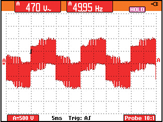 50 Hz馬達(dá)驅(qū)動(dòng)輸出電壓的脈寬調(diào)制信號(hào)的細(xì)節(jié)。1000V,50 微秒的脈沖即導(dǎo)致某些測試設(shè)備的不穩(wěn)定。