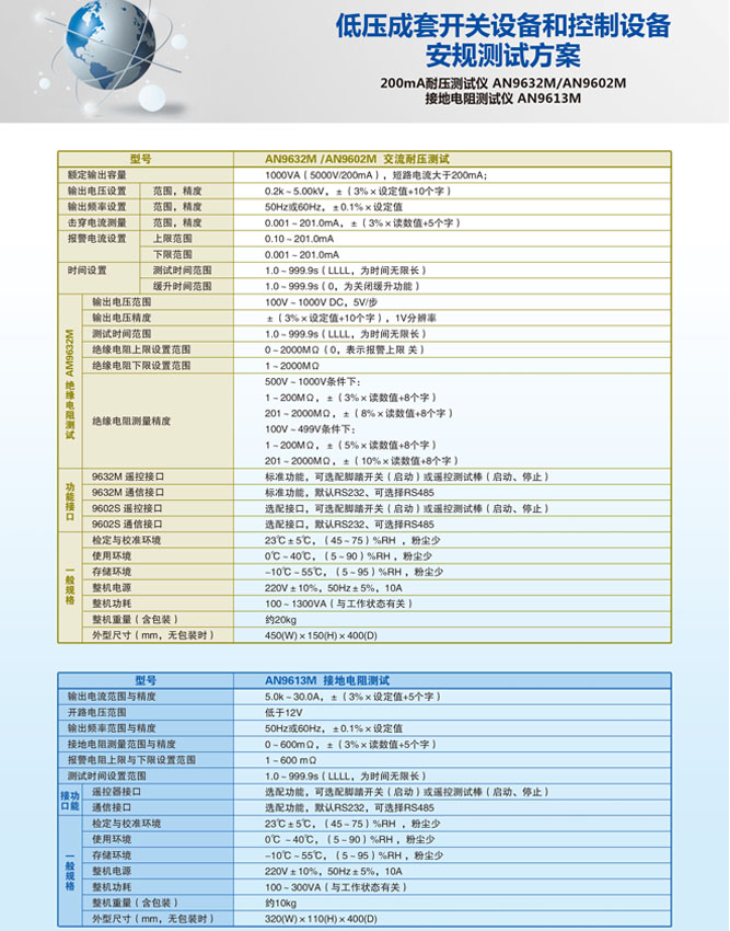產(chǎn)品概述: 艾諾AN9602M耐壓測試儀具備交流耐壓輸出5000VAC/200mA(持續(xù)時間30分鐘),絕緣電阻測量范圍1~2000MΩ,并能快速準(zhǔn)確的完成上述性能指標(biāo)的測試,精密程控絕緣耐壓測試儀,能滿足各電器、元器件生產(chǎn)廠家和質(zhì)檢部門依照國際和國家安規(guī)標(biāo)準(zhǔn)進(jìn)行上述安全性能檢測的要求。 AN9632M絕緣耐壓測試儀具備交流耐壓輸出5000VAC/200mA(持續(xù)時間30分鐘),絕緣電阻測量范圍1~2000MΩ,臺灣絕緣耐壓測試儀,并能快速準(zhǔn)確的完成上述性能指標(biāo)的測試,能滿足各電器、元器件生產(chǎn)廠家和質(zhì)檢部門依照國際和國家安規(guī)標(biāo)準(zhǔn)進(jìn)行上述安全性能檢測的要求。