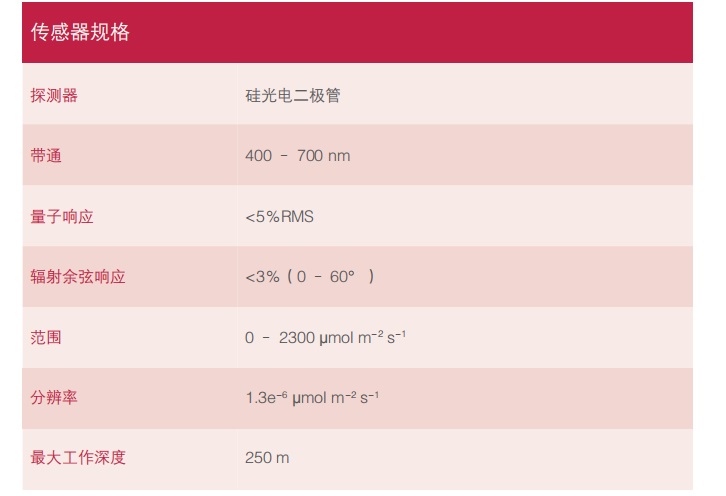 PAR傳感器用于: ● 光衰減的測(cè)量 ● 初級(jí)生產(chǎn)力研究 ● 光合作用-輻照度(P-I)曲線的制定 ● 光抑制研究 ● 水下水生植被(SAV)研究 ● 測(cè)量富營(yíng)養(yǎng)區(qū) ● 研究吸收材料,全自動(dòng)水質(zhì)監(jiān)測(cè)儀,例如DOM,水質(zhì)自動(dòng)在線監(jiān)測(cè)儀,顏料或黃色物質(zhì) ● 光合光子通量密度(PPFD)的測(cè)量